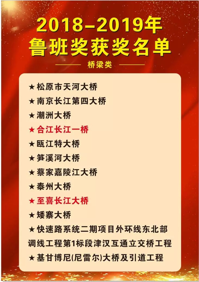 12月10日,建筑業(yè)科技創(chuàng)新暨2018-2019年度中國建設工程魯班獎(國家優(yōu)質工程)表彰大會在北京舉行,共241項工程獲獎,武船重工股份承建的宜昌至喜長江大橋、四川合江長江一橋榜上有名。