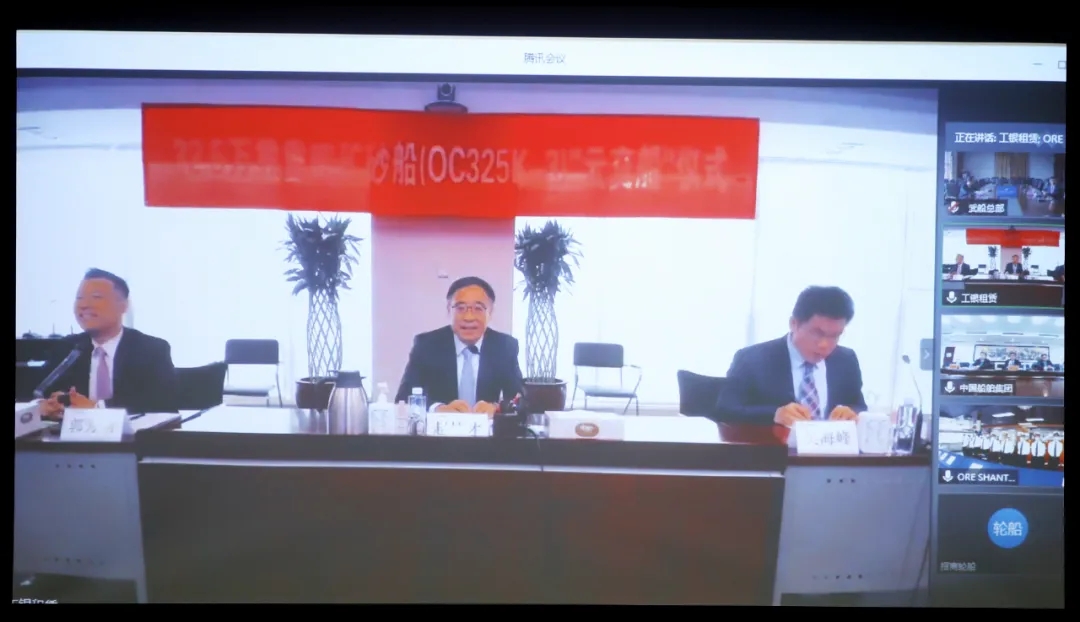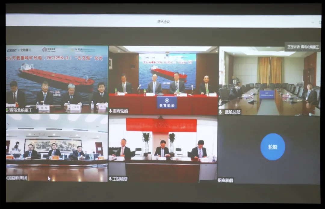 本次“云交船”儀式在北京、香港、武漢、青島4城5地同步舉辦,中國船舶集團副總經理孫偉、招商輪船董事長謝春林、工銀租賃總裁趙桂才、武船集團董事長陳?較群籩麓牽?工銀租賃航運金融事業部執行總經理郭芳萌、武船集團北船重工總經理谷克超代表雙方簽署了交船議定書,武船集團北船重工董事長王國海主持儀式。