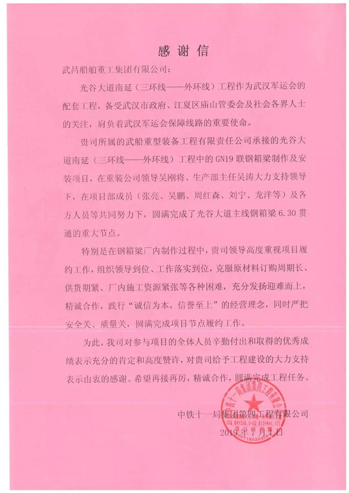 光谷大道南延(三環(huán)線?C?C外環(huán)線)工程作為武漢軍運會的配套工程,備受武漢市政府、江夏區(qū)廟山管委會和社會各界人士的關注,并肩負著武漢軍運會保障線路的重要使命。武船集團重裝公司承接的光谷大道南延(三環(huán)線?C?C外環(huán)線)工程中的GN19聯(lián)鋼箱梁制造及安裝任務,結構重量3347噸,共計82個節(jié)段,在各方人員共同努力下,圓滿完成了光谷大道主線鋼箱梁貫通的重大節(jié)點。特別是在鋼箱梁廠內制作過程中,重裝公司高度重視項目節(jié)點履約工作,組織領導到位、工作落實到位,克服了原材料訂購周期長、供貨期緊、廠內施工資源緊張等各種困難,充分發(fā)揚迎難而上,精誠合作,踐行“誠信為本,信譽至上”的經(jīng)營理念,同時嚴把安全關、質量關,圓滿完成項目節(jié)點履約工作。