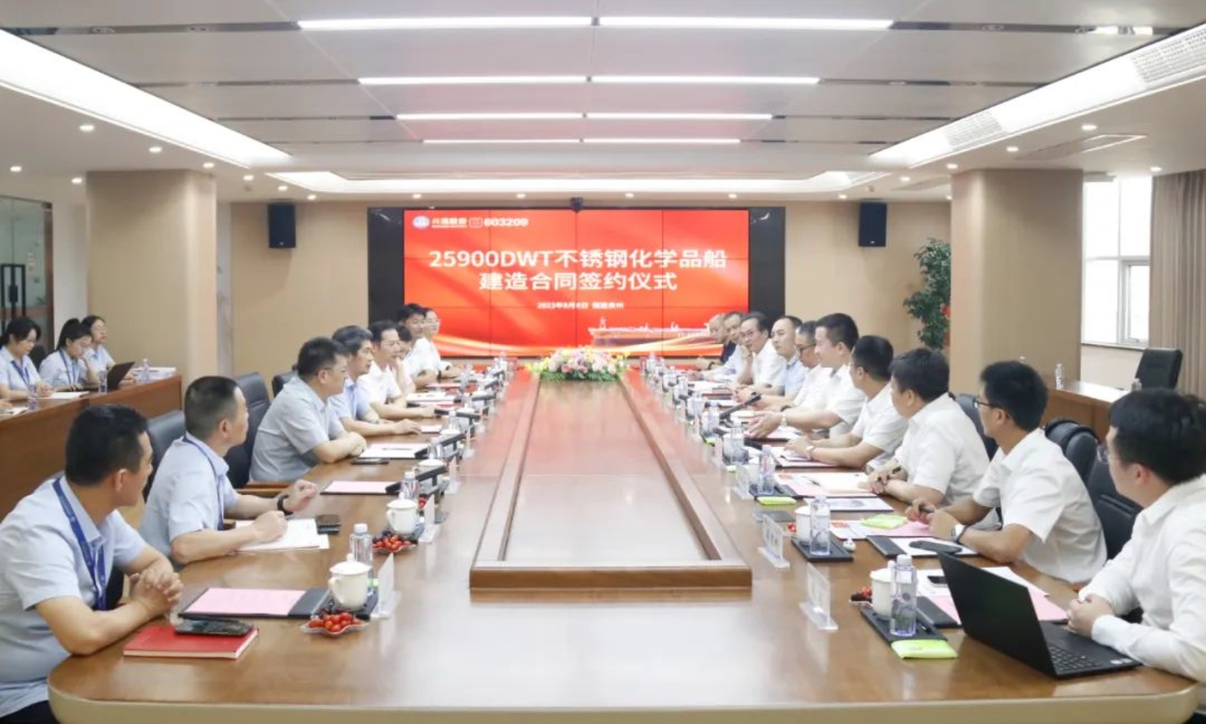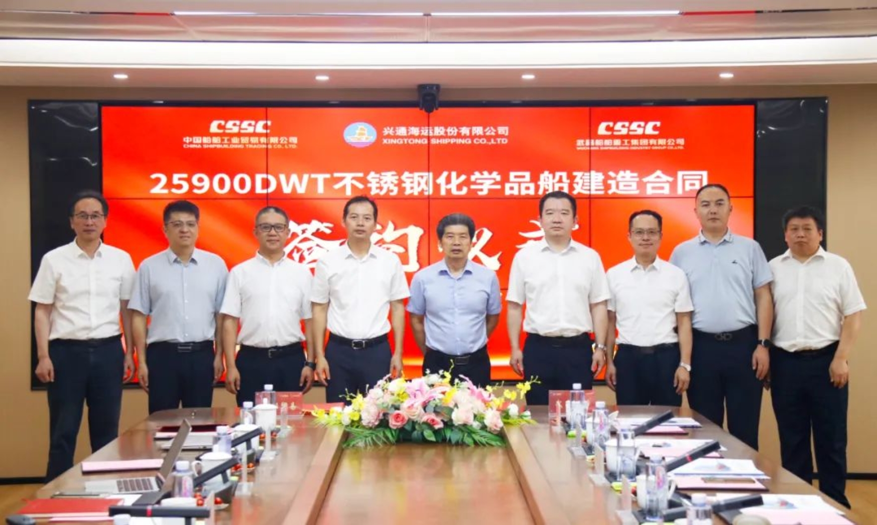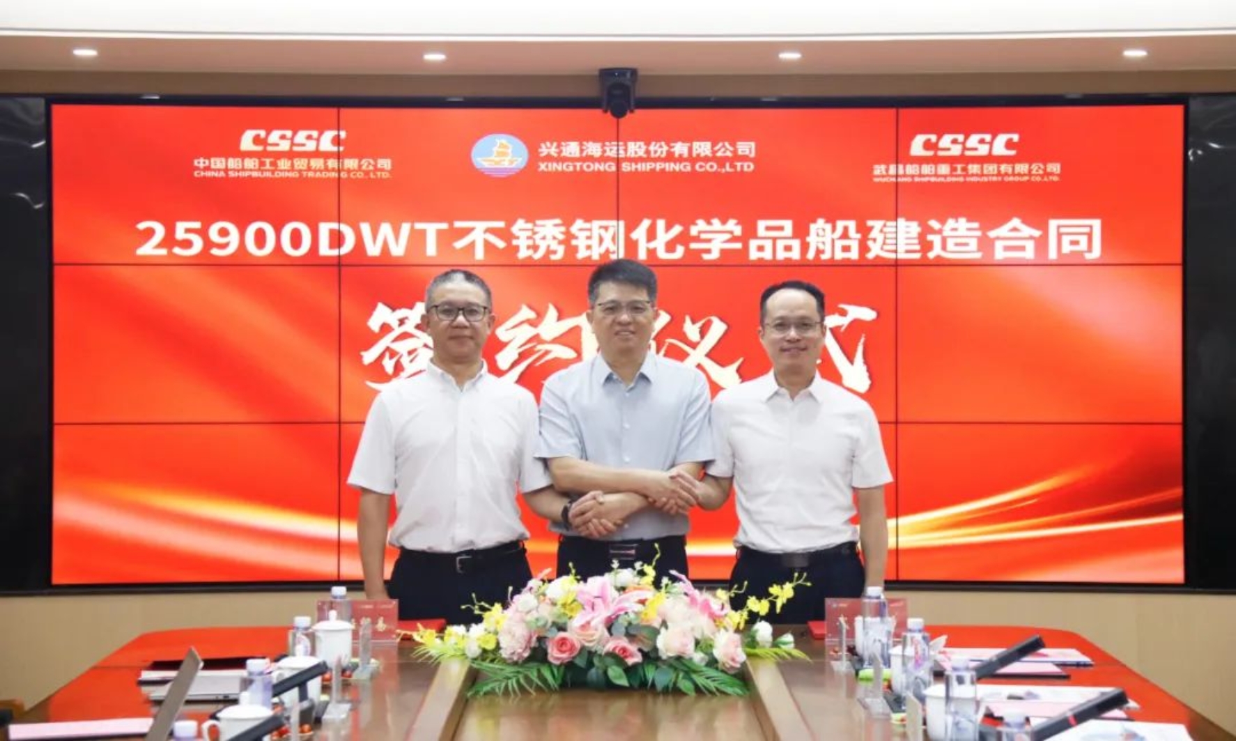 8月8日,中國(guó)船舶集團(tuán)武昌造船聯(lián)合中國(guó)船舶工業(yè)貿(mào)易有限公司與興通海運(yùn)股份有限公司下屬興通海獅航運(yùn)有限公司、興通海豹航運(yùn)有限公司簽訂兩艘25900載重噸不銹鋼化學(xué)品船建造合同。