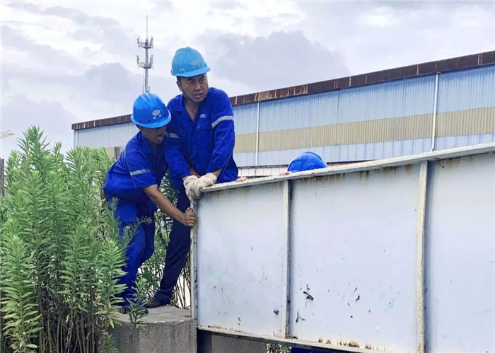 8月10日,啟東市發布臺風橙色預警,暴雨黃色預警,海面大風橙色預警。武船南通順融全體員工在崗值守,嚴陣以待。廠區嚴格執行24小時值班和領導帶班制度,夜間由公司領導帶隊值守,確保防臺防汛工作扎實開展。下午4時,在做好一切準備工作后,武船南通順融按照啟東市防臺防汛指揮部要求將防汛堤閘門關閉。