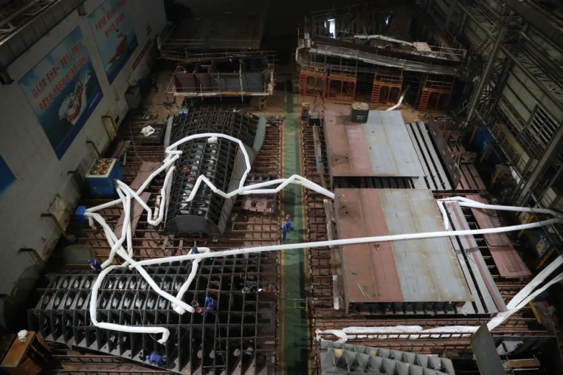 希臘1100箱集裝箱船1號船總工藝師安志杰表示:“分段部結(jié)合船型特點和現(xiàn)有設(shè)施,以提升效率為基點,和設(shè)計人員聯(lián)動,通過提前謀劃、高效焊接、舾裝前移、即刻溝通等措施,實現(xiàn)了分段高效制造和完整轉(zhuǎn)序,確保了后續(xù)建造周期。”