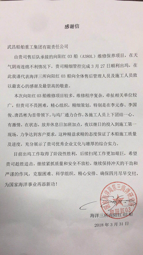 這封姍姍來(lái)遲的感謝信中,國(guó)家海洋局海洋三所表達(dá)了對(duì)武船集團(tuán)全體售后人員最衷心的感謝及最崇高的敬意,特別對(duì)公司售后小組精心組織策劃、團(tuán)結(jié)一心、夜以繼日、精益求精的態(tài)度給予高度贊揚(yáng)和肯定!