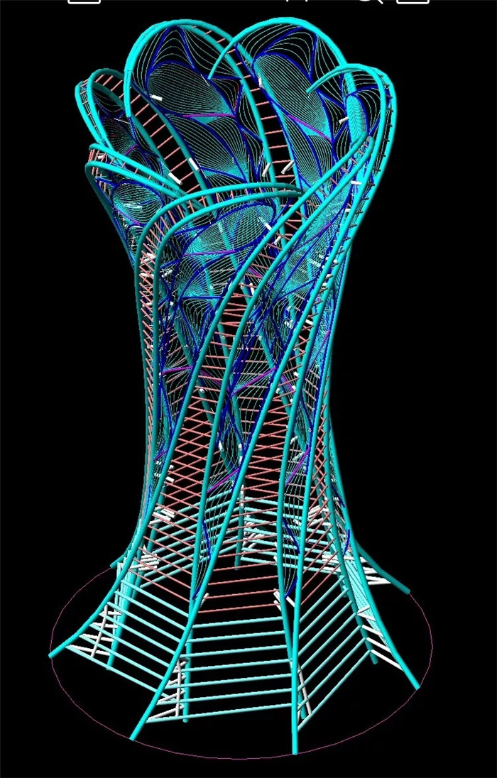 火炬塔周身“飄帶”的設計難點主要是三維扭曲的空間結構,既要確?,F場數據建模十分精準,又要考慮實際施工過程中高空交叉作業等問題,所以最大程度上要避免干涉情況發生。