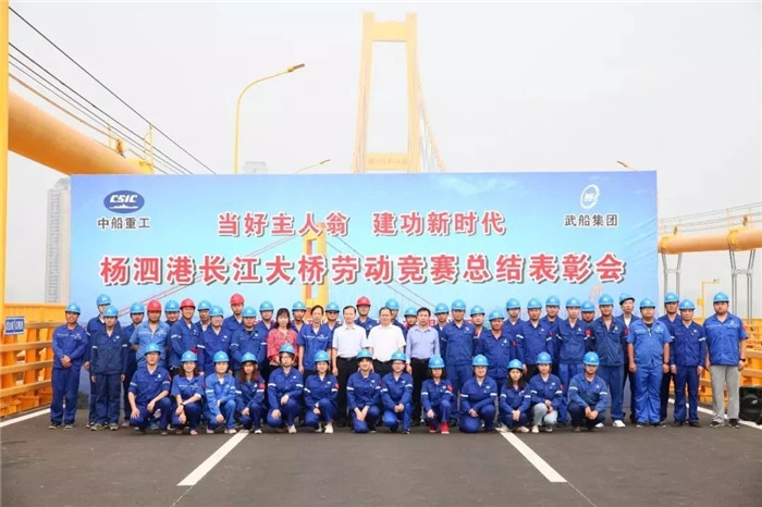 武船重工股份先后在楊泗港大橋上開展了“獻(xiàn)禮十九大 大戰(zhàn)120天”專項勞動競賽、聯(lián)合武漢市總工會開展了“當(dāng)好主人翁 建功新時代”勞動競賽活動,先后創(chuàng)下了“單個項目單日發(fā)運5100噸”“36天完成全橋節(jié)段吊裝”等新紀(jì)錄。