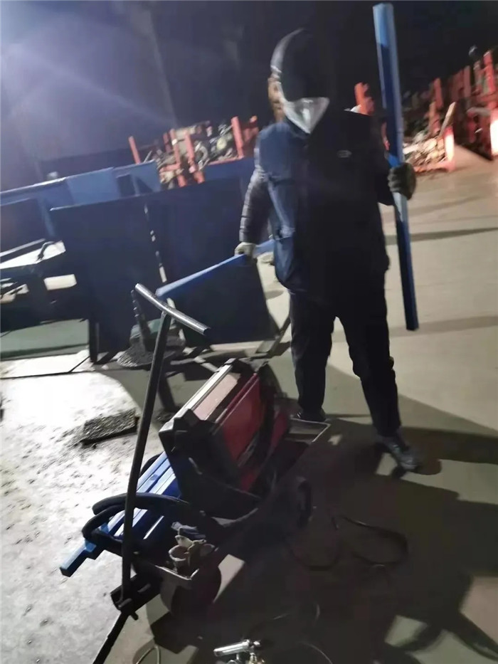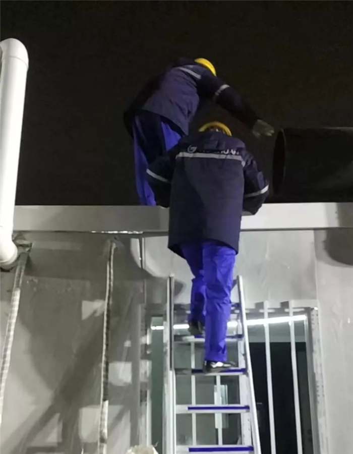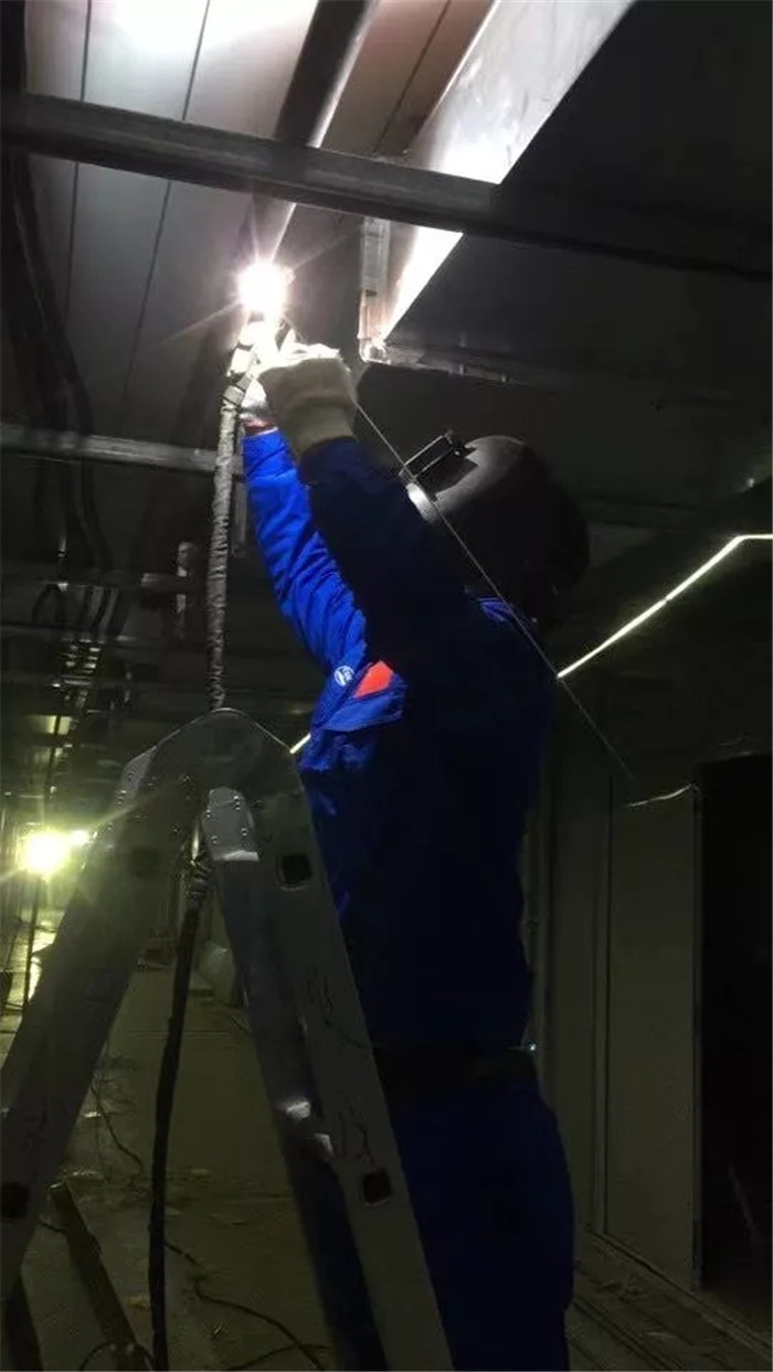 焊接時,大家發(fā)現(xiàn)這里的所有管件都沒有坡口,且裝焊時需要踩著梯子、抬著管子、仰著頭,卡在風管和電纜中間僅20-30cm的間隙內操作,但這些對于“久經(jīng)沙場”的軍工師傅們來說真的不值一提。