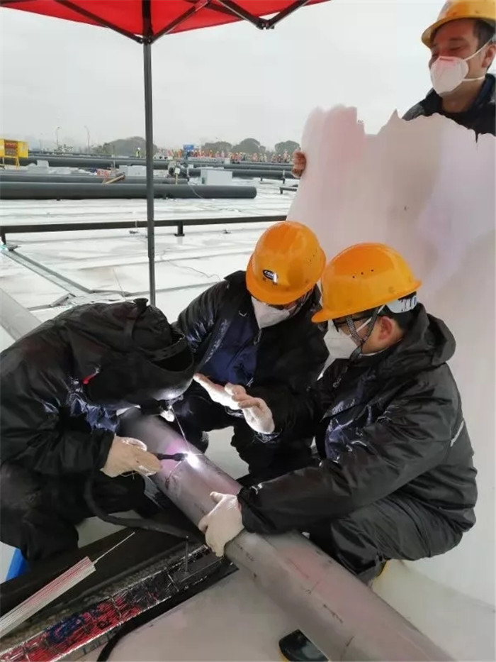 為了高質量完成施工任務,最大程度上避免環(huán)境因素影響,史善全、張志鋼、金英將管路初步安裝到位后,在隊長的帶領下就地取材,利用硬紙板和帆布搭起了臨時的焊接“小帳篷”,以方便陳繁強、黎文世進行氬弧焊施工。