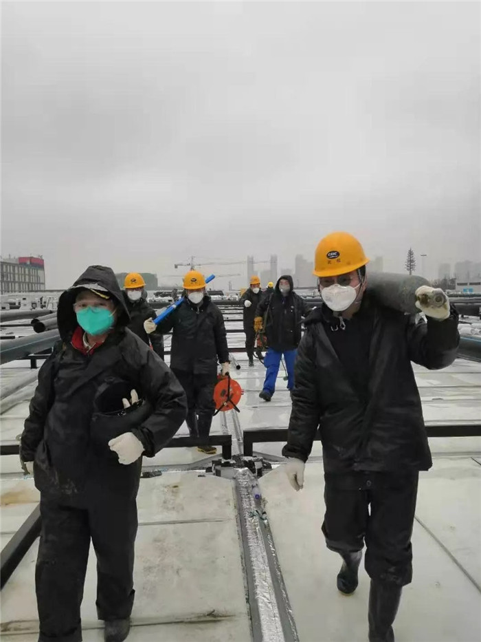 △雷神山醫(yī)院頂樓天臺現(xiàn)場冒雨施焊接作業(yè)