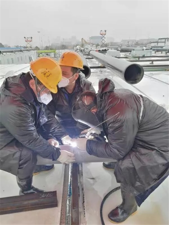 “雷神山頂樓天臺A6、A8區(qū)域供氧管路,共由300余米直徑110mm主管、600余米直徑48mm、89mm支管及少量三通管件組成。2月5日晚下了一場大雨,造成天臺積水。2月6日清晨,我們施工時,天空仍飄著淅淅瀝瀝的小雨,還伴著2-3級的東北風,這些環(huán)境因素主要給我們的焊接工作造成了一定程度上的影響。”陳小軍介紹道。