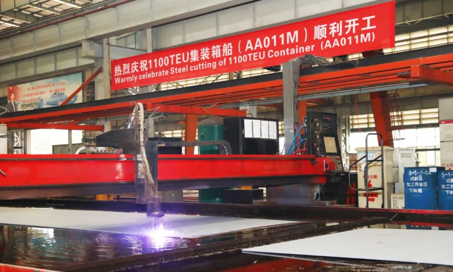 5月17日11時(shí)18分,武昌造船為希臘船東Cosmoship建造的1100TEU集裝箱船首制船在雙柳廠區(qū)順利開工。船東代表、BV船級社、中船貿(mào)易相關(guān)領(lǐng)導(dǎo)及公司相關(guān)部門代表、產(chǎn)品三總師參加開工儀式。