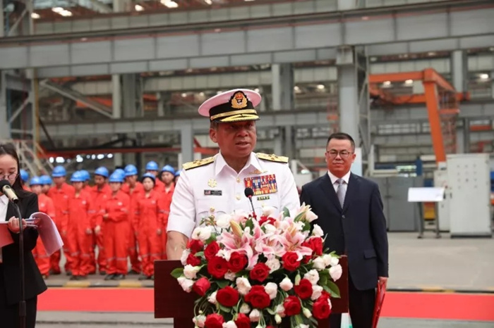 中船重工副總經理何紀武、馬來西亞皇家海軍司令卡瑪魯扎曼上將赴開工現場并致辭??ì旚斣?,何紀武,莫實德船廠總裁拉姆利,國防科工局軍貿與外事司副巡視員馬衛華,中船重工總經理助理、中國船貿黨委書記、董事長徐子秋,武船集團黨委書記、董事長楊志鋼共同觸摸水晶球,啟動切割指令。